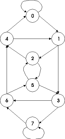 Each sequence can be followed by exactly two others. In the case of sequence 0 and sequence 7, one of the two possible following sequences is the same as the current sequence. In all cases, the two possible following sequences are equally likely, since the coin is assumed to be balanced. This is represented diagramatically in the figure below.